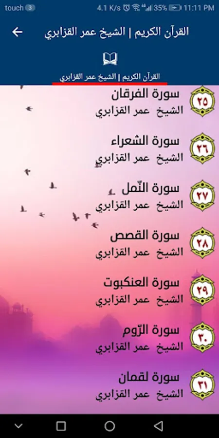 The application of the Noble Qur’an with the voice of Omar Al-Qazbari enables you to listen to all surahs of the Noble Qur’an after specifying the name of the surah that you want to listen to, which Sheikh Omar Al-Qazbari recites in each surah.
