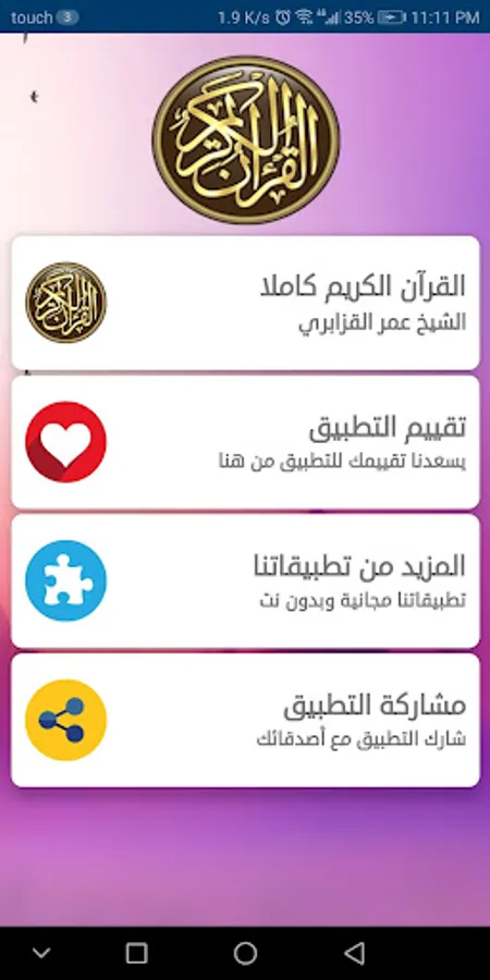 You can share the link of the program with your friends on various social media so that they can benefit from the Noble Qur’an program with the voice of Omar Al-Qazbari and enjoy its features, the most important of which is that it is a simple free application that fits with all phones occupying a simple space on the device.
