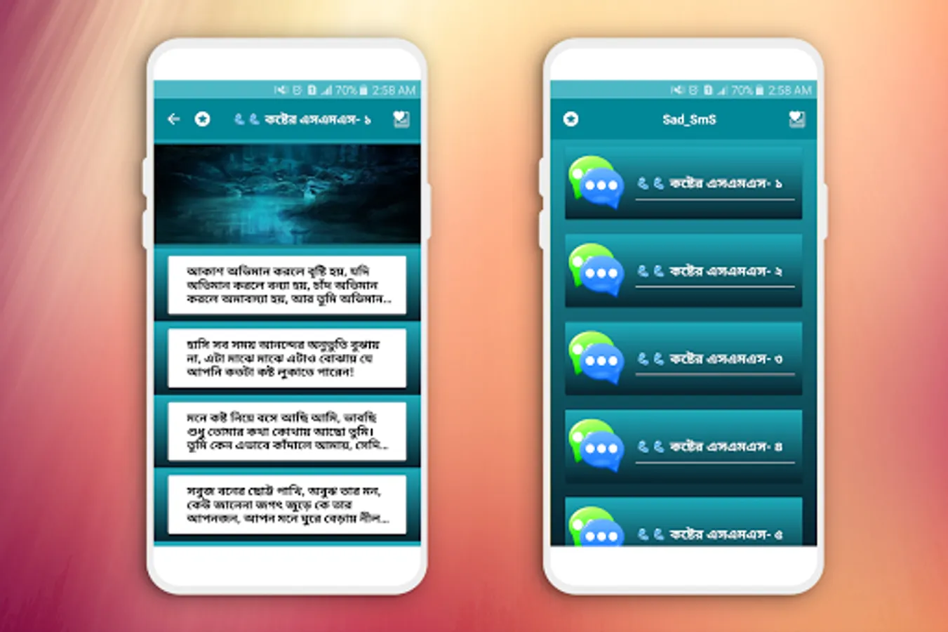 আপনার সেই কথা গুলো প্রকাশ করার জন্য আমরা নিয়ে এলাম রাত জাগা কষ্টের এস এম এস ২০২০। এখানে আপনার মনের মত সকল bangla koster sms বা ম্যাসেজ গুলো পাবেন যা আপনার মনের মানুষকে না বলা কথা গুলো প্রকাশ করতে পারবেন। খুব সাজানো গুছালো আমাদের অ্যাপটি যা আপনার sad sms bangla 2020 এর এস এম এস গুলো বাছাই করতে সহজ হবে। অ্যাপটি এমন ভাবে তৈরী করা, যার মেসেজ গুলো বাংলা sad status অথবা বাংলা কষ্টের স্ট্যাটাস হিসেবেও ব্যবহার করতে পারবেন। আশা করি অ্যাপটি আপনার ভালো লাগবে, ধন্যবাদ।