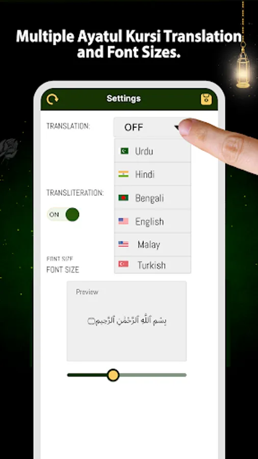 ✅ Ayatul kursi English translation app can increase and decrease the font size of Ayat ul kursi text.
