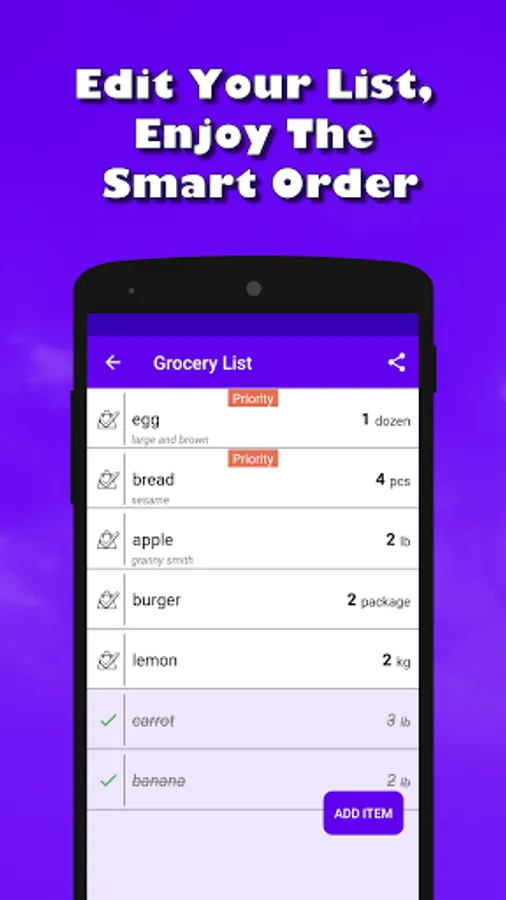 -- With smart sorting, priority items are shown at the top of the grocery shopping list.