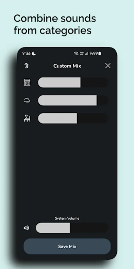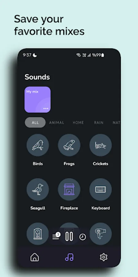 You can create a mix using multiple relaxing sounds and create your own custom audio. You can save the mixes you create.