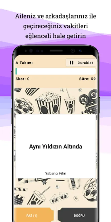 - After these settings, when the narrator is ready, the time starts and the narrator tries to tell the movies that appear on the screen without making a sound during this time. If the narrator's teammates know the movie he is talking about, Right, if the narrator makes any noise while he is telling it, Mistake, if the narrator does not want to tell the movie, he uses the Pass buttons.