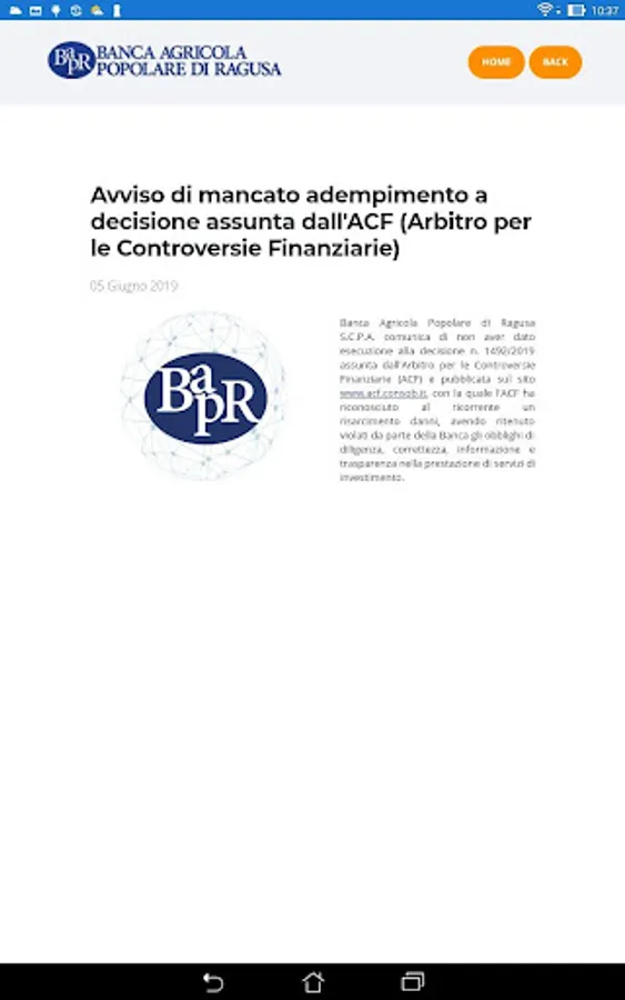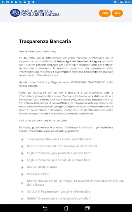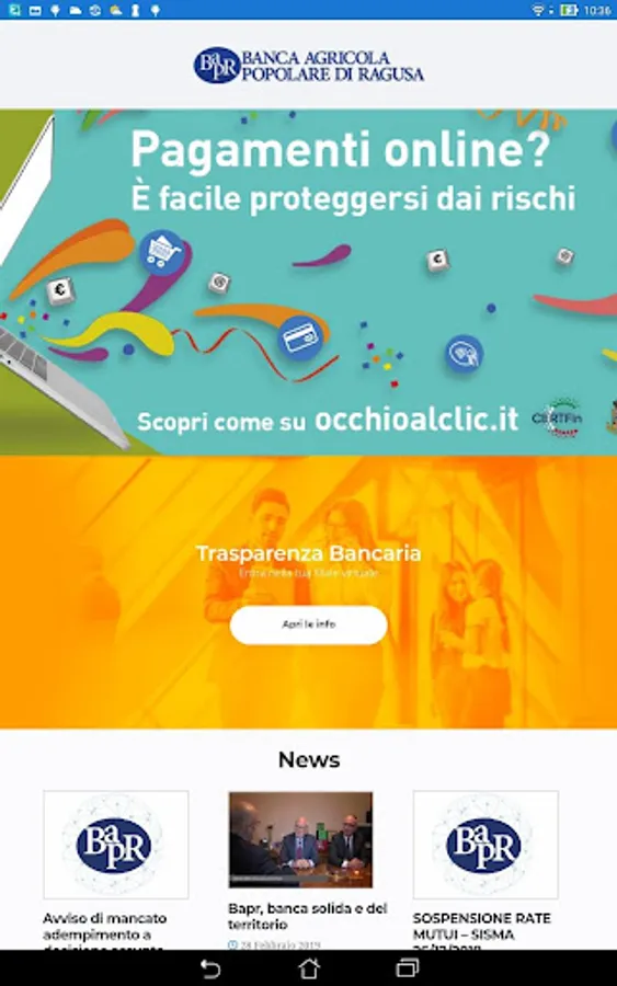The Totem BAPR app was developed specifically for the totems present in the various branches of the Banca Agricola Popolare di Ragusa. Using this app, the users of the totems can navigate through the touch screen between the information on Banking Transparency, also by consulting the documents, and view the latest relevant news.