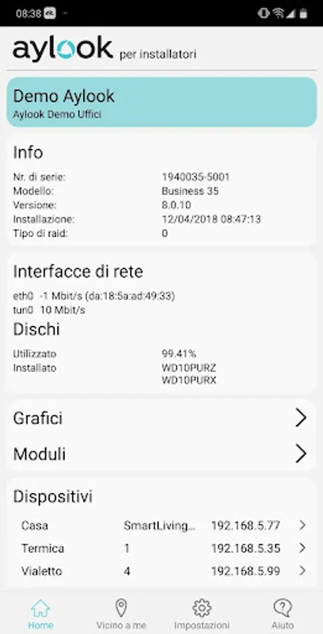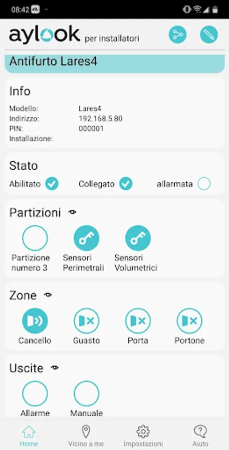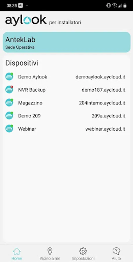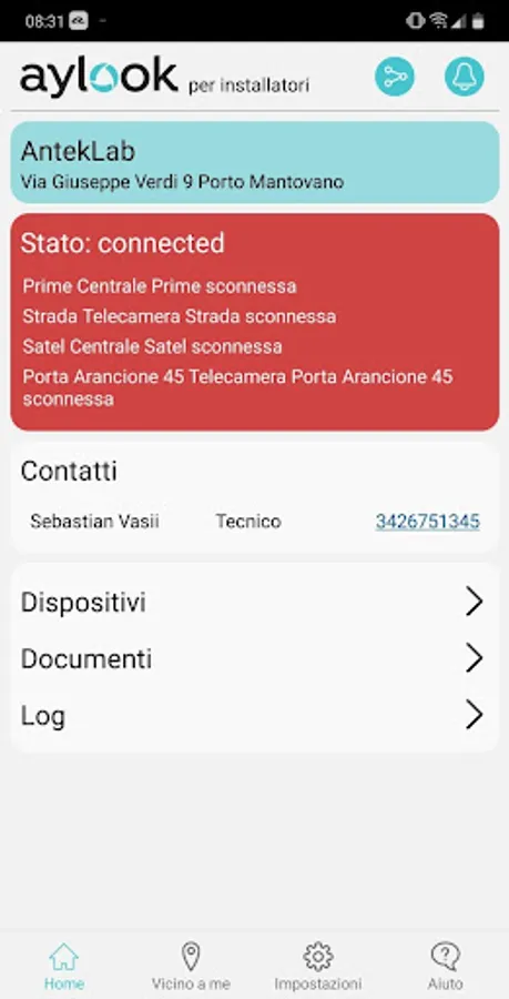 The app is permanently connected with the VMS centralizer installed on site. The centralizer supports numerous devices and various brands and models of anti-intrusion control units (AVS, BENTEL, BOSCH, INIM, KSENIA, SATEL, TECNOALARM, UTC) and video recorders (Aylook, HIKVISION, DAHUA, PROVISION, TVT).