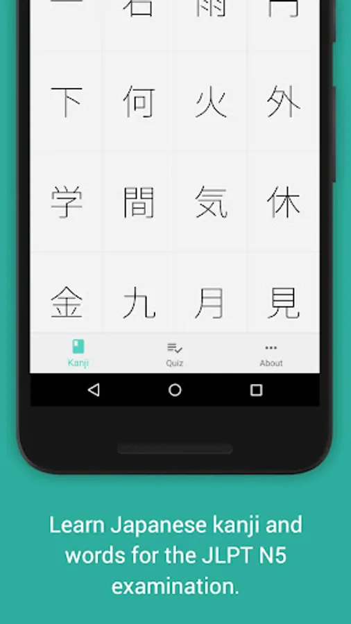 KANJI JLPT N5, existing also on iOS, will help you learn Japanese kanji and words (non-exhaustive list) for the JLPT N5 examination.