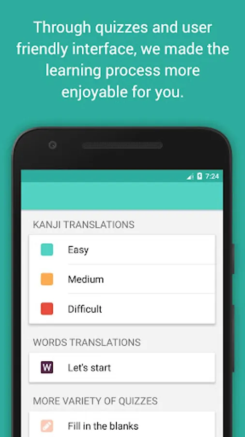 - Different kind of fun quizzes such as « Fill in the blanks », « Find the antonym », « Play with numbers », « Kanji », « Words » and even the possibility to create custom quizz.