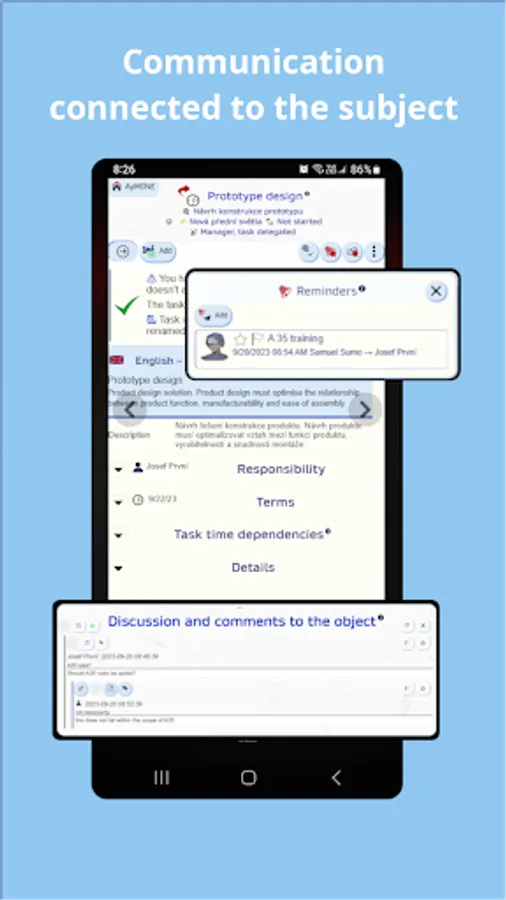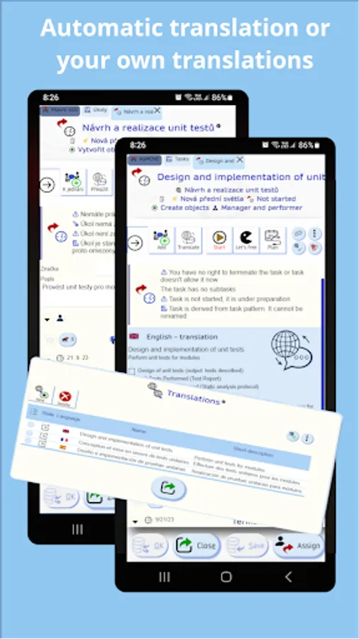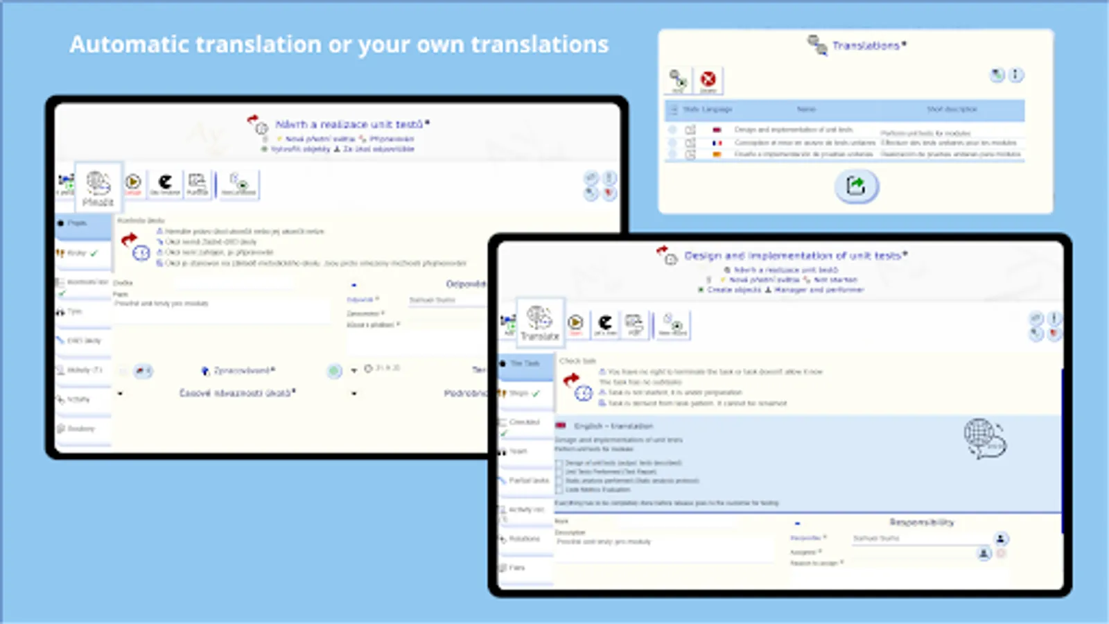 AyMINE Business is multilingual application supporting cooperation of international teams. It manages task description, methodologies as well as internal and external communication in all languages used in your business. You can even translate the communication on-the-fly (only some European languages).