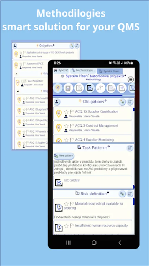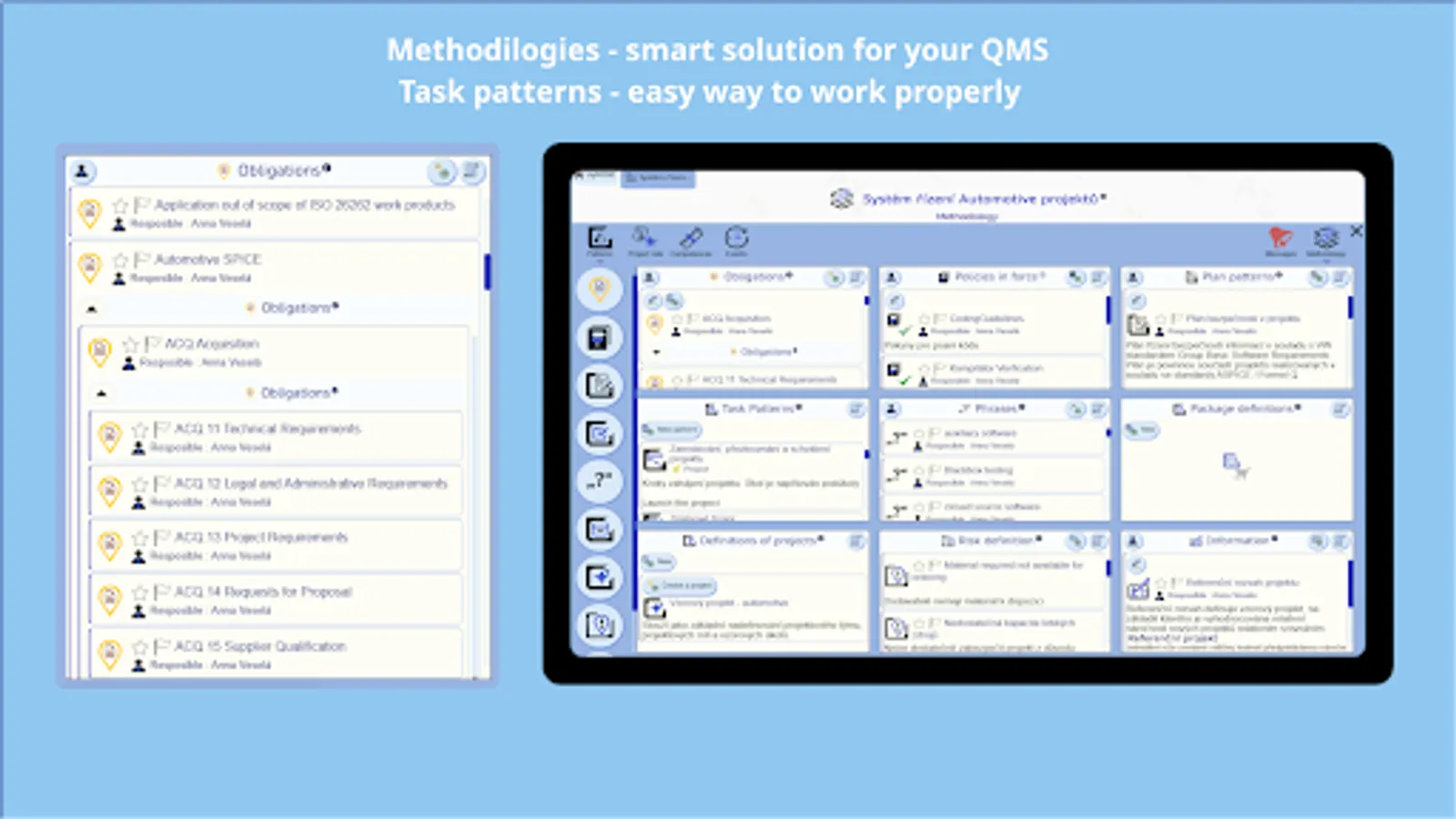 Methodology support radically simplifies all tasks management required by a quality system. Regardless, what standard you shall fulfil – ISO 9001, ISO 26262, ISO 20000, drug certification etc. the AyMINE controls the tasks and records all steps for both internal verification and external audits.