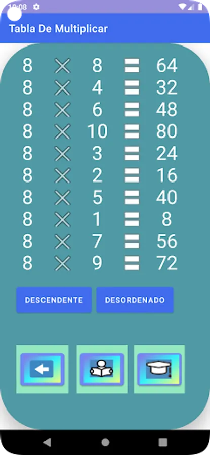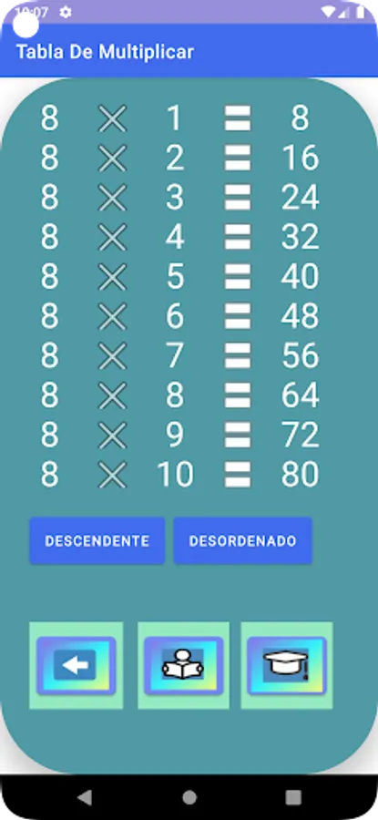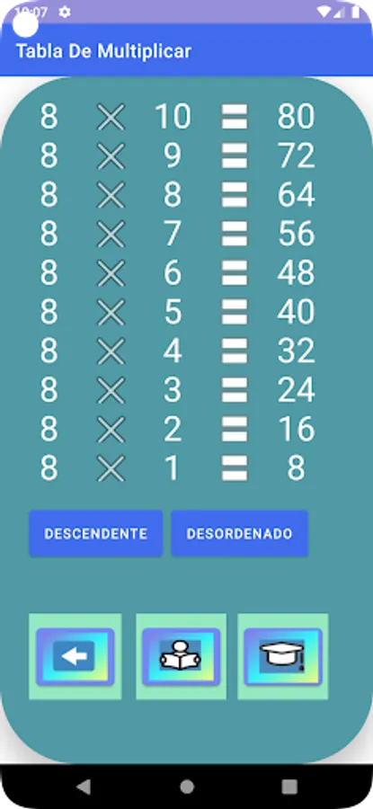 Aprende mientras te diviertes interactuando con ésta app. Todas las tablas de nivel básico en orden ascendente, descendente o al azar. Elige el resultado entre 4 opciones y si ya eres avanzando coloca el resultado directamente. Mejora cada vez tu resultado se va mostrando en un tablero digital.