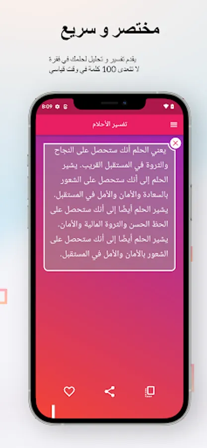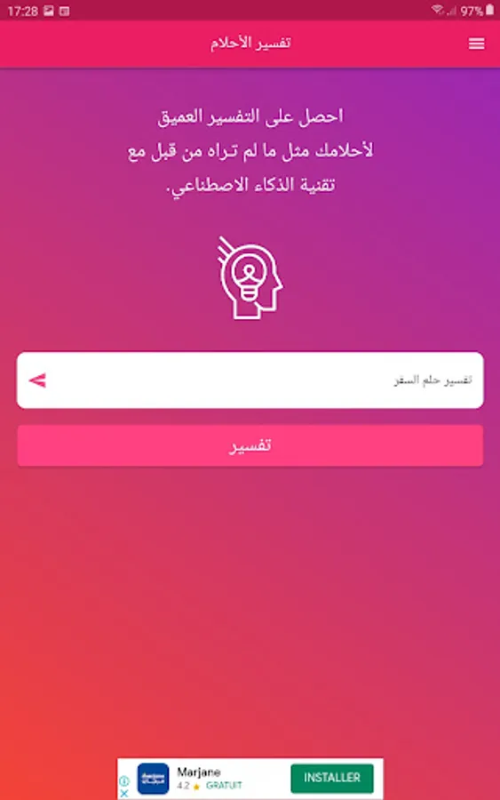 In short, the application of "Interpretation of Dreams by Ibn Sirin with Artificial Intelligence" is a unique application that aims to provide an accurate and comprehensive interpretation of dreams, and uses modern technology and artificial intelligence to analyze and interpret dreams quickly and accurately, and relies on reliable sources found in traditional Arabic books. The application also features an easy-to-use interface, modern design, and can be downloaded for free on the Google Play Store.