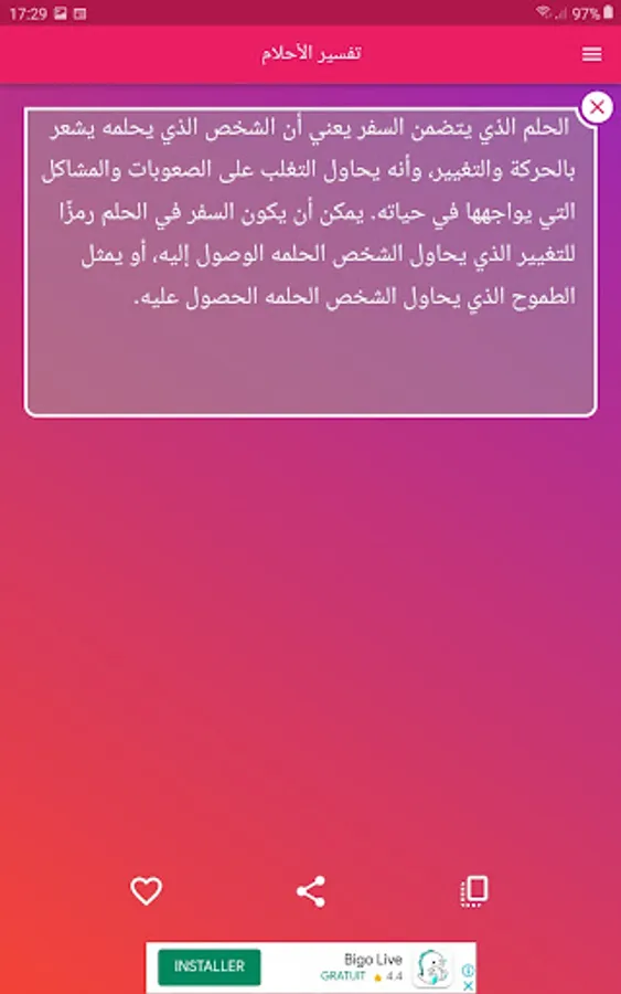The application has an easy-to-use interface and a modern design, as it is characterized by diversity and comprehensiveness in the interpretation of dreams and covers various topics and symbols that appear in dreams. It also allows the user to search for the interpretation of a specific dream and find the appropriate interpretation quickly and easily.