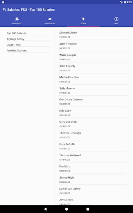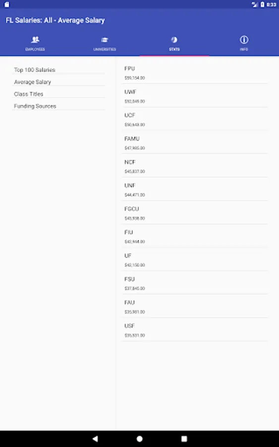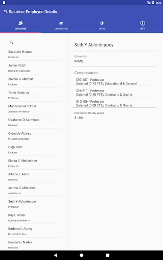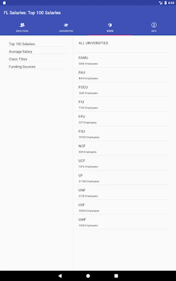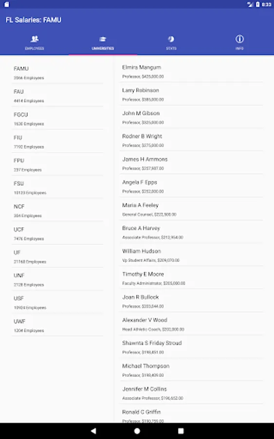 The Florida University Salaries App is the single best source for payroll information of employees of Florida's State university System. This easy-to-use app is for anybody who is interested in learning how much an employee of any Florida public university makes in their field of work.