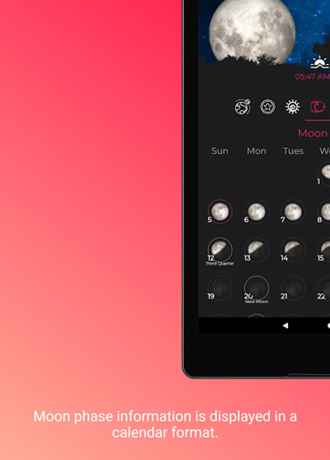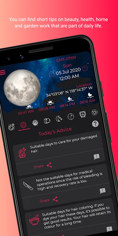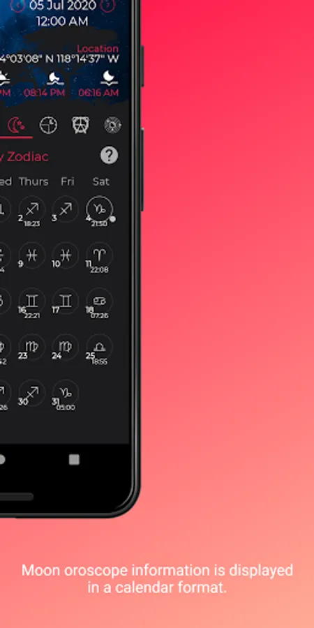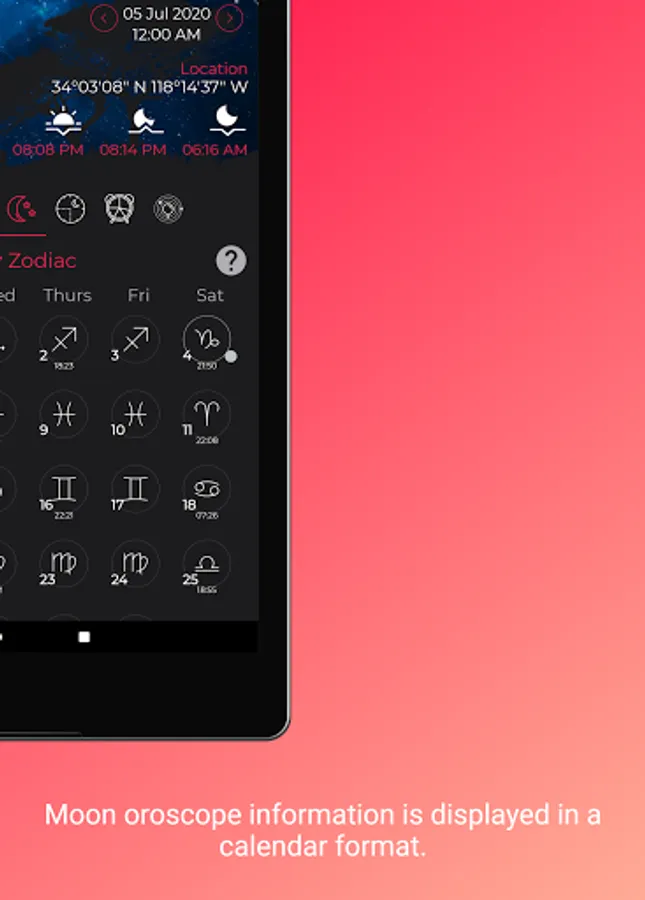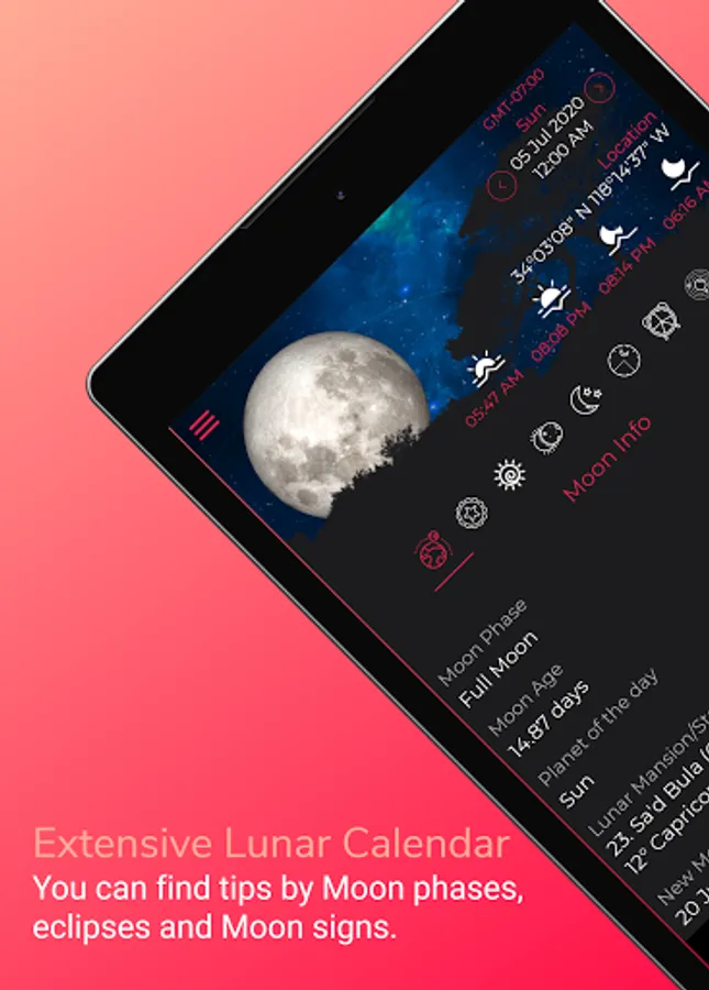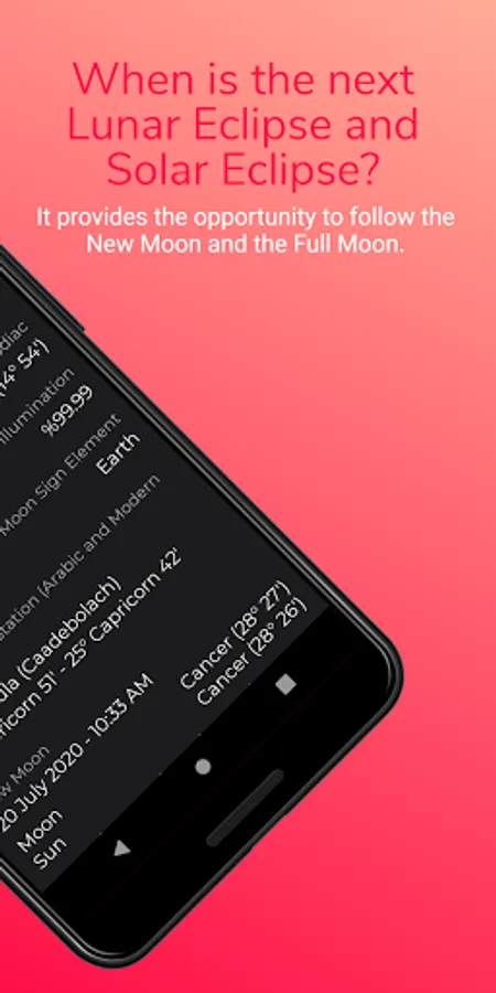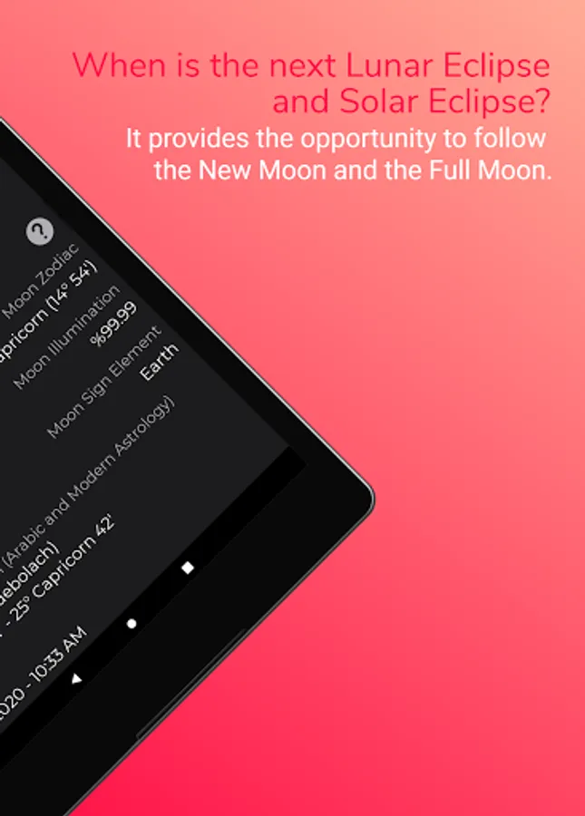 This app offers you information according to the Moon's horoscope and Moon Phase information. It provides the opportunity to follow the New Moon and the Full Moon. You can also easily follow Solar Eclipses and Moon Eclipses. In the application you can receive notifications about topics that interest you.