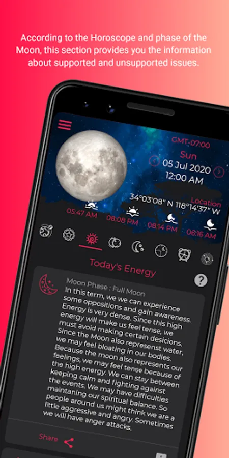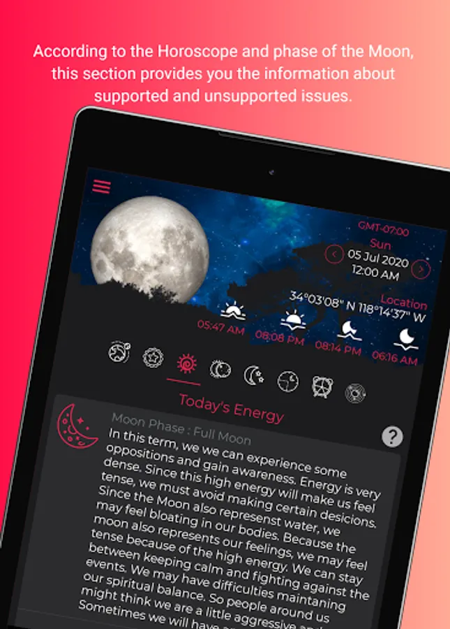 🌕 Energy of the day: According to the Horoscope and phase of the Moon, this section provides you the information about supported and unsupported issues.