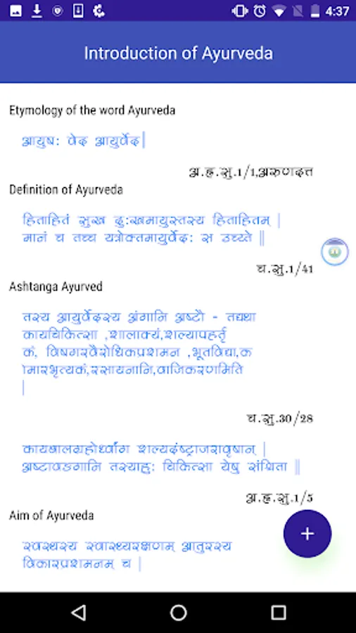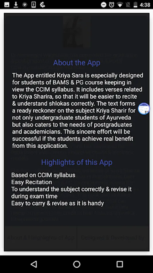 The App entitled Kriya Sara is especially designed for students of BAMS & PG course keeping in view the CCIM syllabus. It includes verses related to Kriya Sharira, so that it will be easier to recite & understand shlokas correctly. The text forms a ready reckoner on the subject Kriya Sharir for not only undergraduate students of Ayurveda but also caters to the needs of postgraduates and academicians. This sincere effort will be successful if the students achieve real benefit from this application.