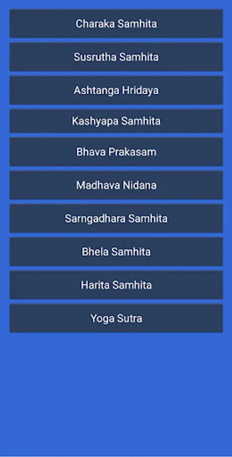 collection of Charaka Samhita,Susrutha Samhita,Ashtanga Hridaya,Kashyapa Samhita,Bhava Prakasam,Madhava Nidana,Sarngadhara Samhita,Bhela Samhita,Harita Samhita and Yoga Sutra. only in sankrit shloka available no description.