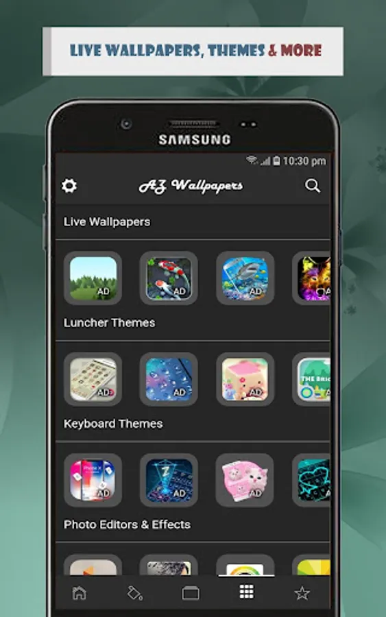 - 4th partition: It contain the top applications of Live Wallpapers, Launcher Themes, Keyboard Themes and Photo Editor & Effect to help user to edit his downloaded wallpapers.