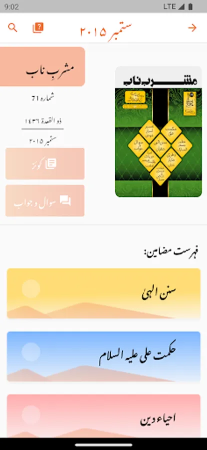 Mashrab e Naab(مشربِ ناب) is a monthly Islamic magazine published by Matab Publications. It includes magazines on the topics of true religion in the light of the Holy Quran.We know that, to stay in touch with Islam we have to practice it in our daily lives. Mashrabenaab covers Islamic aspects of our lives and our roles in the society we are living in. This magazine contains the pure ideology of Islam in true meanings, analysis of current affairs in our society and around the world in words of the great Islamic scholar Allama Syed Jawad Naqvi(آغا سید جواد نقوی). He teaches the philosophy of religion, Ahkaam, Ibaadat, Mehdviyat & many more aspects of Islam. Mashrab e Naab is published from Jamia Urwa tul Wusqa Lahore for the people who eager to get true knowledge of pure teachings of Islam.The word "مشرب ناب" means a source of pure water. This magazine explains by its name that it contains pure & true knowledge and magnificent teachings of Islam.