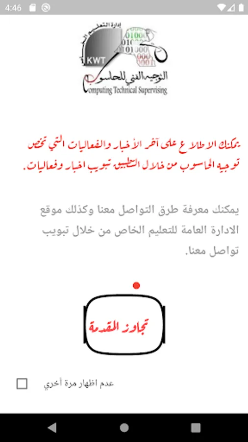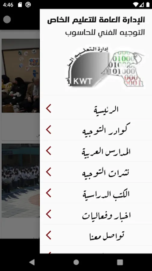 The application of computer technical guidance in the General Administration of Private Education in the State of Kuwait contains a definition of technical guidance and its technical cadres - and the schools that it supervises with their locations and how to reach their site - in addition to bulletins with the latest developments - as well as news and events of interest to technical guidance for the computer - with the addition of prescribed textbooks - also How to contact us through the available communication methods