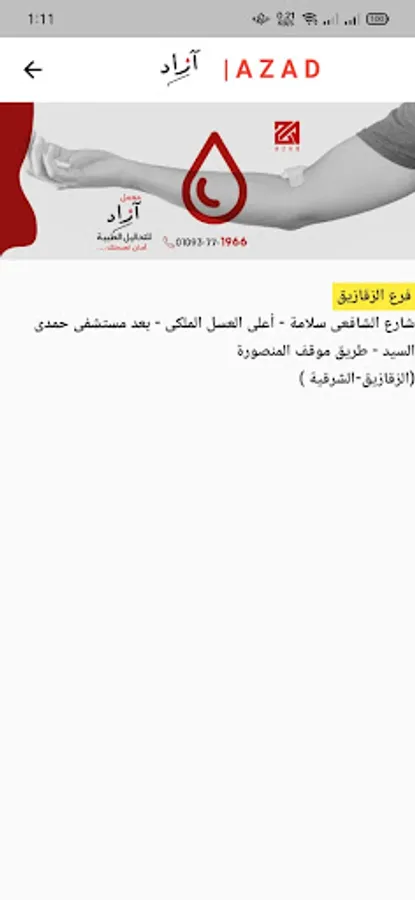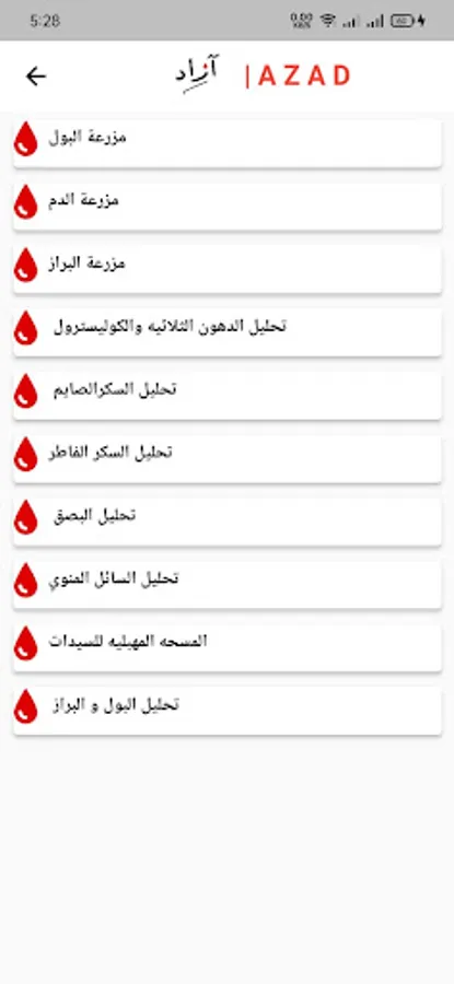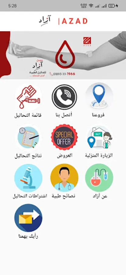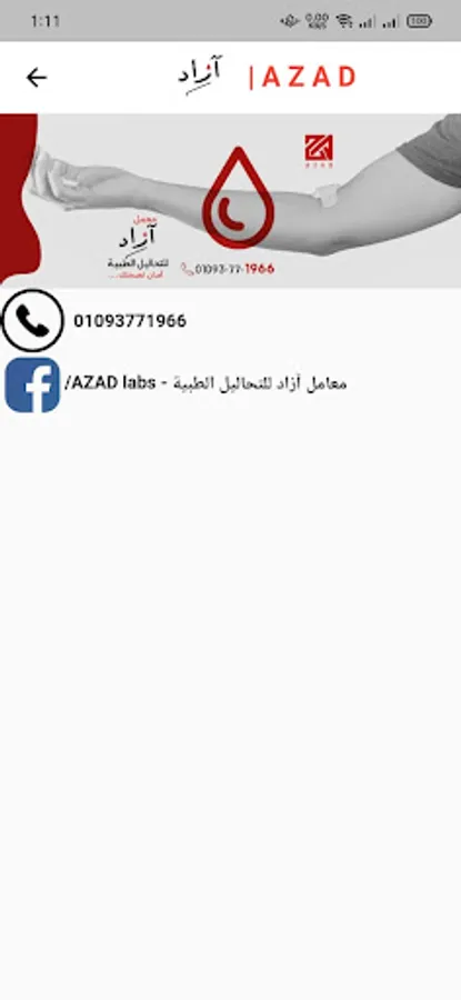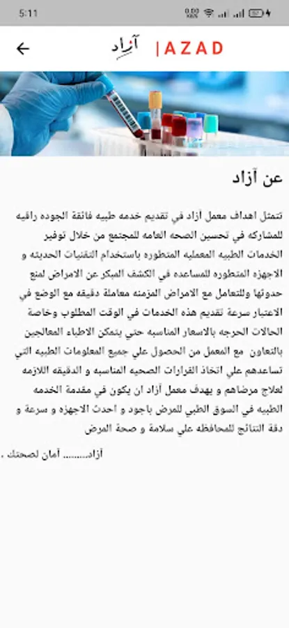 تطبيق معمل آزاد.يساعدك التطبيق على معرفة شروط التحاليل وبعض النصائح . ويمكنك استلام النتايج ومعرفة التحاليل المتاحة