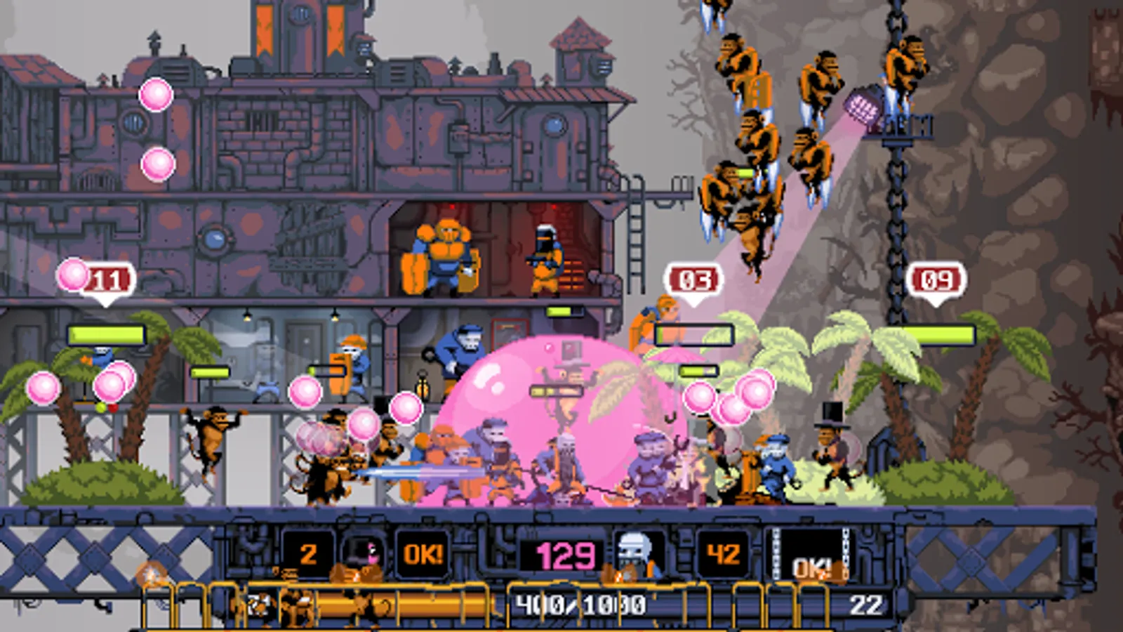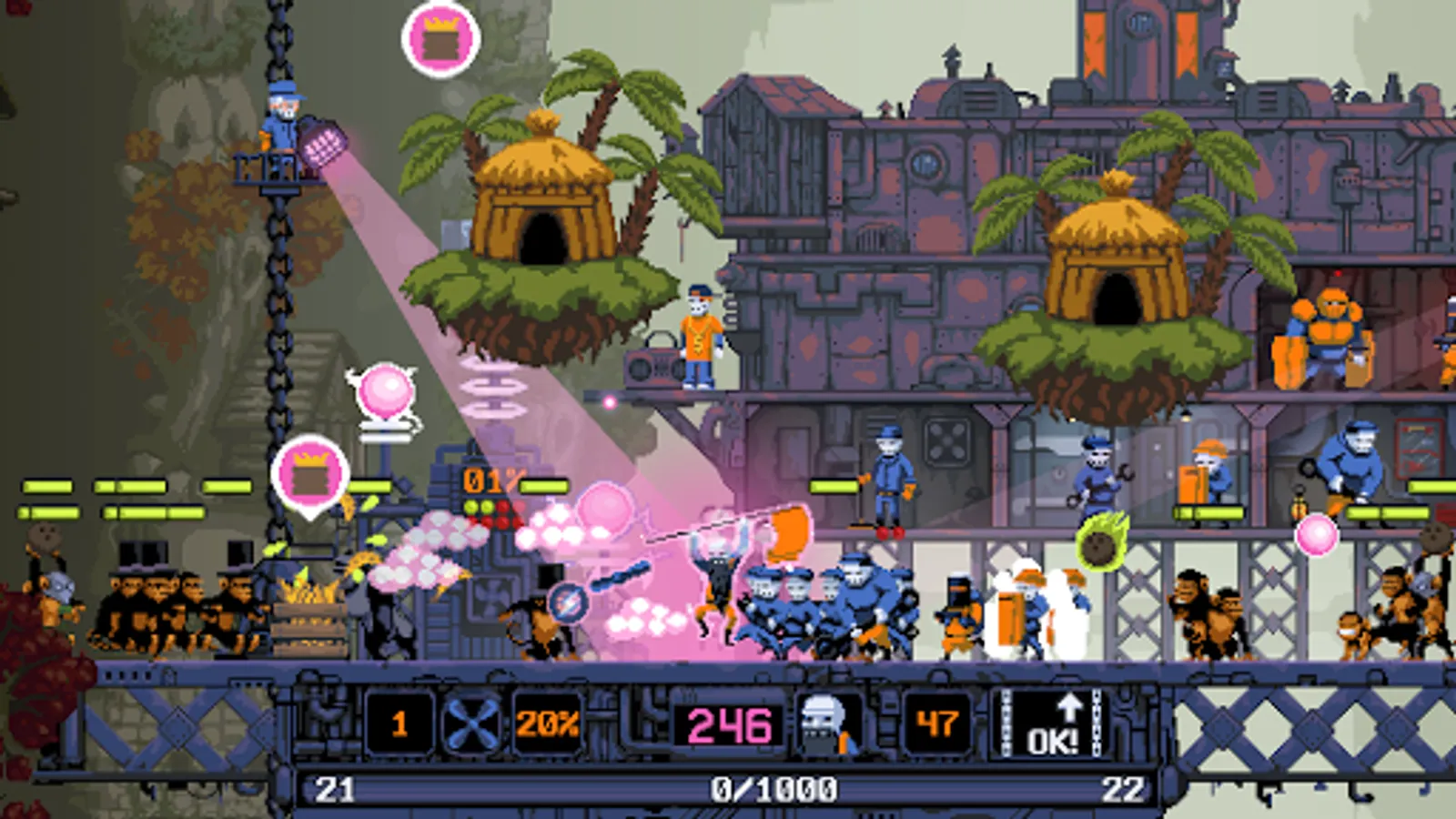 *Collect chickens and produce energy using a special, non-violent method to upgrade the city and unlock abilities. The city gives you NPC assistants and squad members, and abilities let Vladimir take down opponents in increasingly showy ways, like summoning a pink worm to slow your enemies then using a giant wrench to deal a devastating blow.