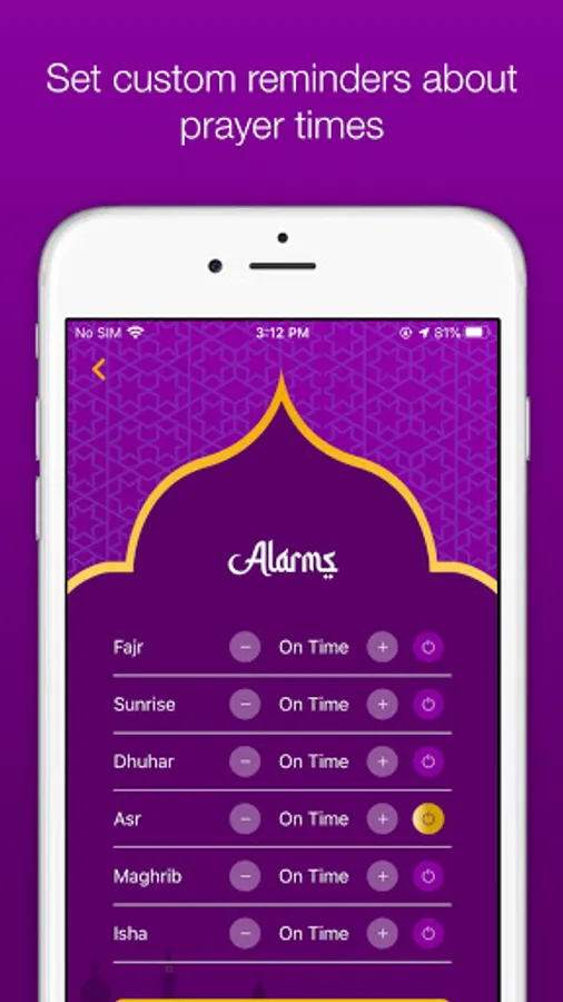 You can customise when would you like to be reminded about the prayer times. So if the local mosque or your workplace have slightly different times, you can manually adjust the time of reminders.