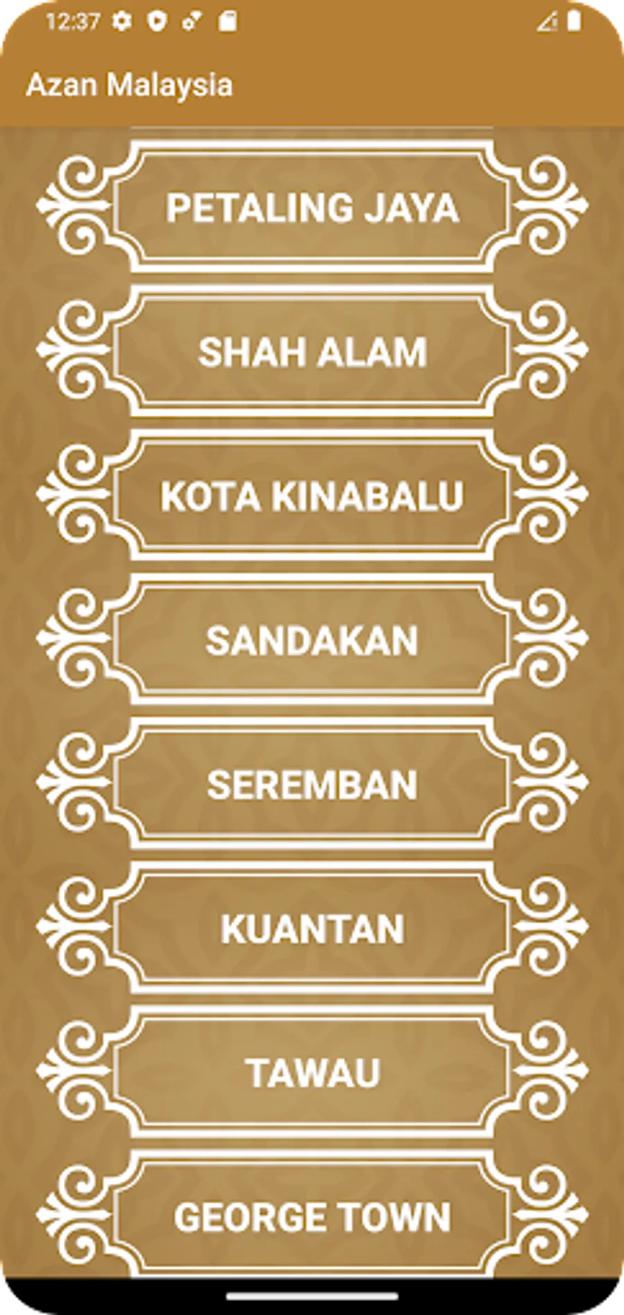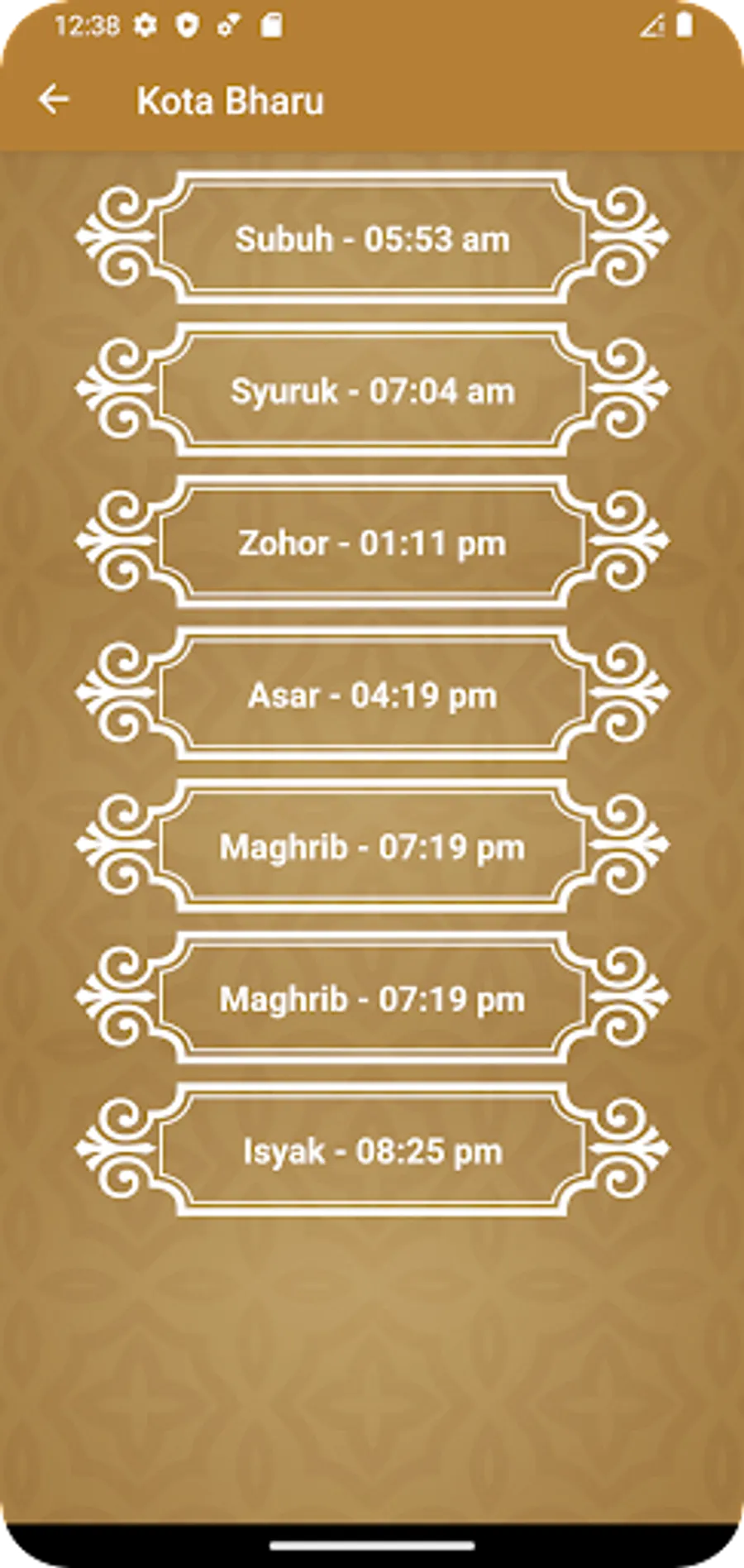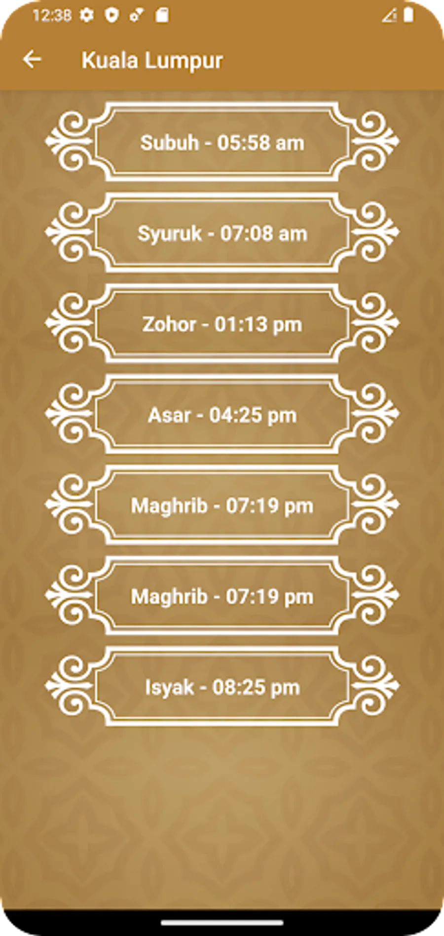 Waktu solat dan azan: Imsak, Subuh, Syuruk, Zohor, Asar, Maghrib dan Isyak.