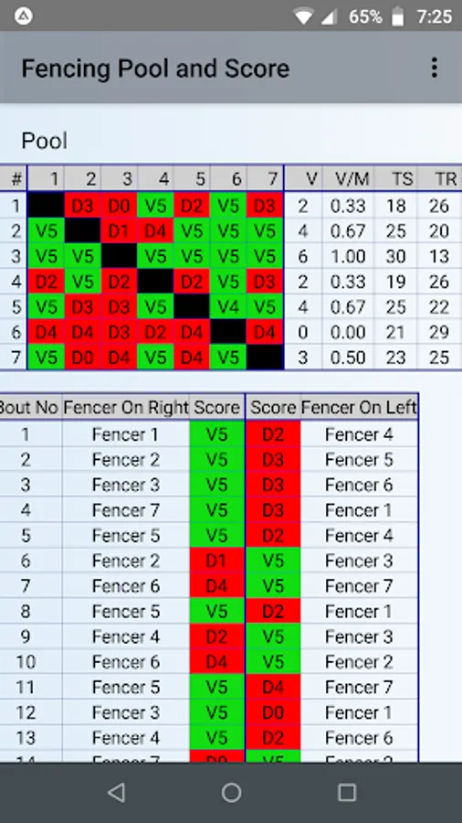 This app allows you to create a pool of 4 to 10 fencers as well as generating the USA Fencing bouting order that goes with each pool size. One can start bouts by holding down on the individual bouts in the bouting order, and once a bout is completed, one is prompted on whether or not they would like to store the result to the pool table. Bouts are stored based on the numbers assigned to each fencer at the top of the scorekeeper, and if the fencers are off sides, one can simply reverse the numbers at the top (e.g. 4-6 to 6-4). The pool table provides a zoomable visual representation of the pool that is filled out automatically as bouts are completed. It also provides additional information such as the victoires, victories over matches, touches scored, touches received, and indicator of each fencer. One is also able to go back and change scores and reassign victories of bouts that have previously been completed. With this, one can simply focus solely on directing during the pools and until the pool is over to fill out the pool sheet.