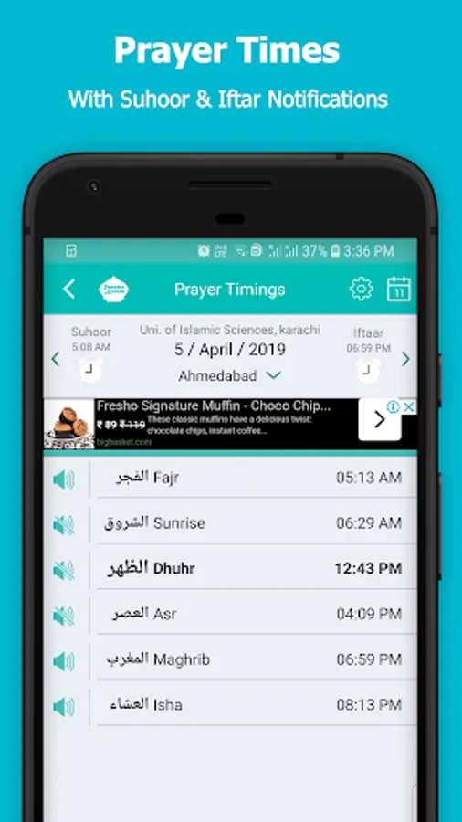 • Athan Notifications :- plays you're selected Azan at prayer times