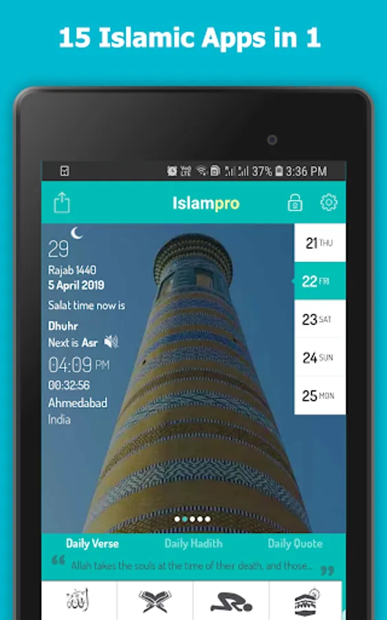 • Quran Verse of the Day, Hadith Daily and Daily Islamic Quote reminders