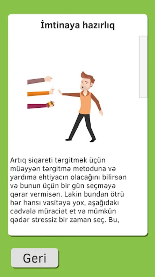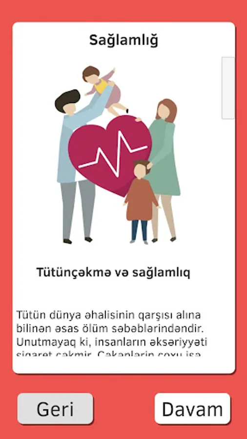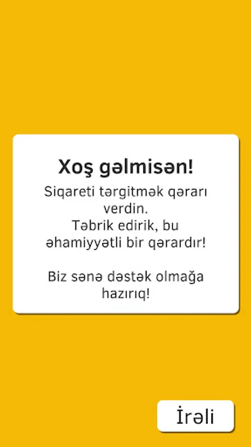 The "Quit smoke" mobile application have been created in 2018, in accordance with the current country tobacco control policy, the Public Health and Reforms Center (PHRC) of the Ministry of Health of Azerbaijan Republic with support from World Health Organization country office.