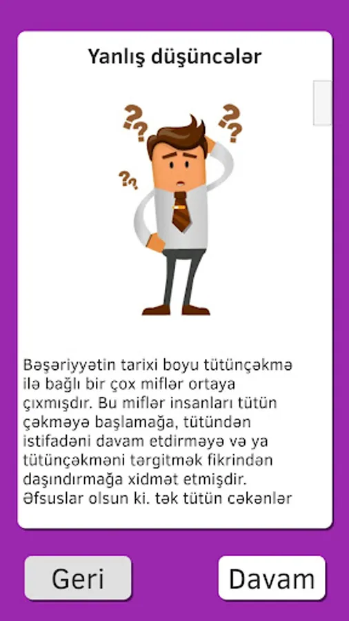 Also in this program there is a nicotine dependence test, information about the smoking hazards, as well as myths associated with it, and other useful information.