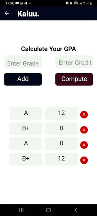 With this app you can calculate your GPA by just inputting your grades and credits, after entering and adding the grades and credits for all your subjects, you can finally compute your GPA and get to know not only your GPA but also the class of your GPA.