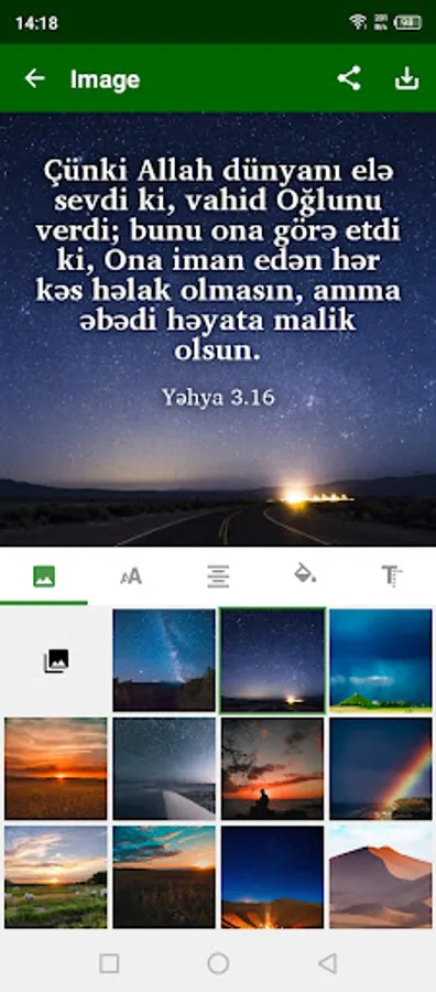 • When you tap on a verse, an image button is shown on the bottom toolbar. When this button is pressed, the ’Edit image’ screen appears. You can choose the background image, move the text around the image, change the font, text size, alignment, format and color. The finished image can be saved to the device and shared with others.