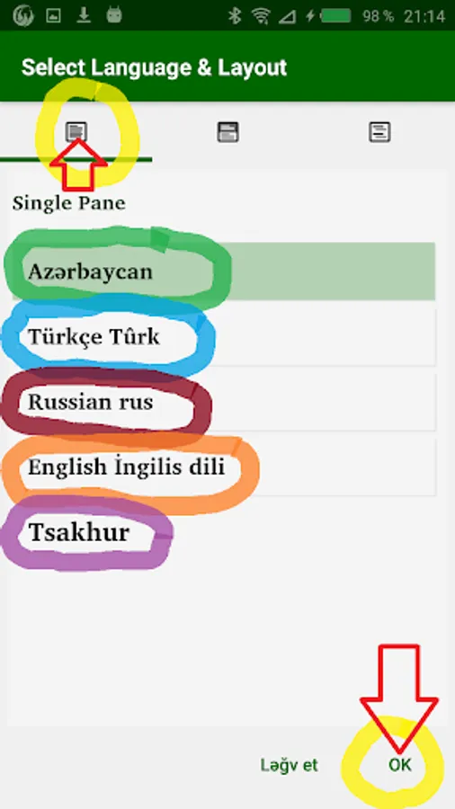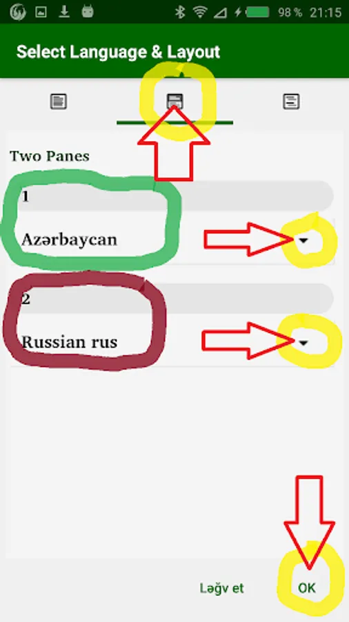 - "two panes" to display the Azerbaycan at the top and the Turkish or Russian or Tsakhur the English version at the bottom