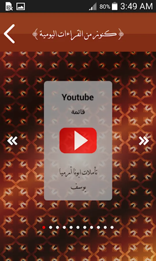 The application "Treasures of the Daily Readings" is a free application affiliated to Mark Maher Channel, which is dedicated to publishing the "treasures of daily readings according to the order of daily reading in the ritual of the Coptic Orthodox Church" which is a "series of sermons, meditations, lectures and masses of Father Jeremiah Youssef, "Priest of the Church of St. George, Qena", idea, photography, editing and directed by Mark Maher