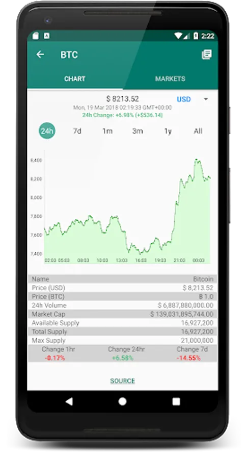 ✓ Simply click on the coin and it will take you to a different screen with: Coin Details, Charts, Alerts and Exchange Markets 😊