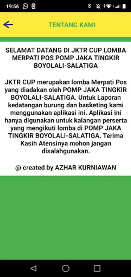 The JT Rcae application is a report replacement application using WA or WA. Reporting and Basketing is done with this application. the application is only for the participants of the Jaka Tingkir POMP competition
