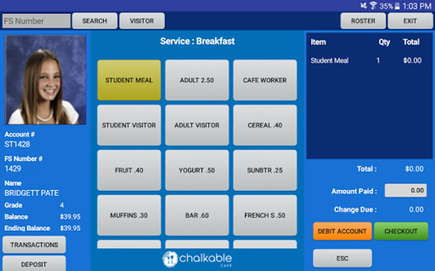 Enhance your food service operation by utilizing the Chalkable Cafe Point-of-Sale on Android! We hope you enjoy our tablet version of the point-of-sale that features amazing speed, great stability and the ability to implement a mobile point-of-sale while still utilizing your existing desktop, all-in-one or laptop cafeteria solution.