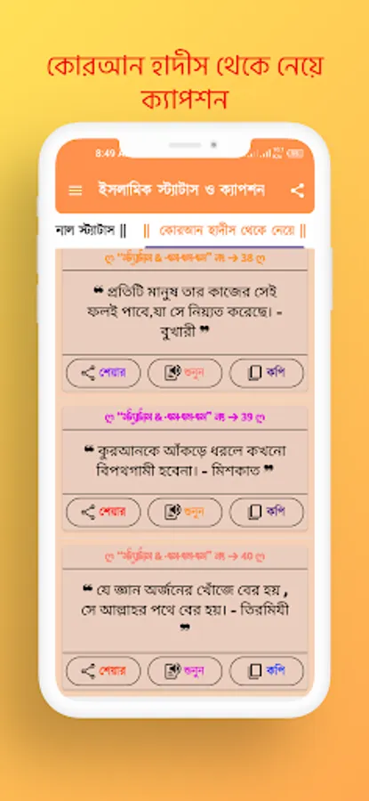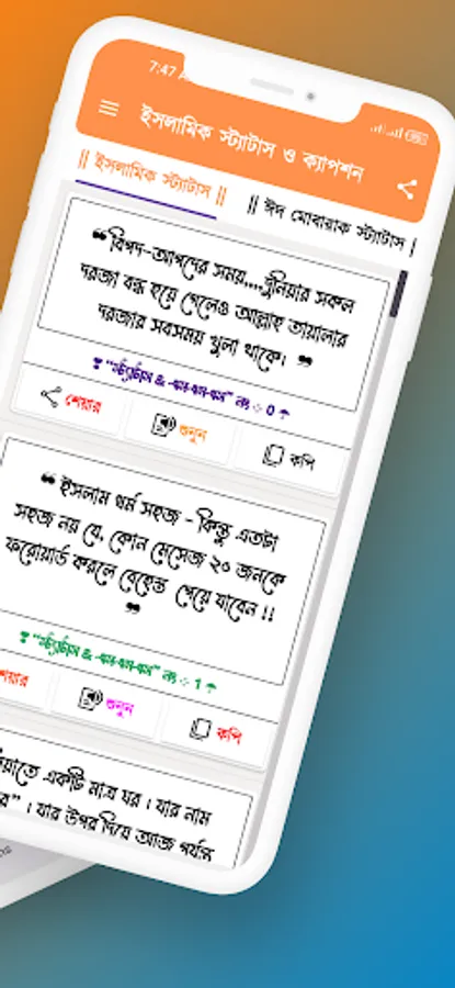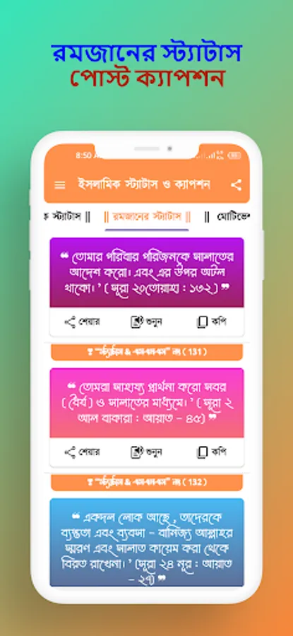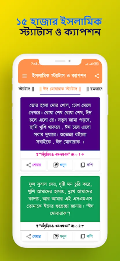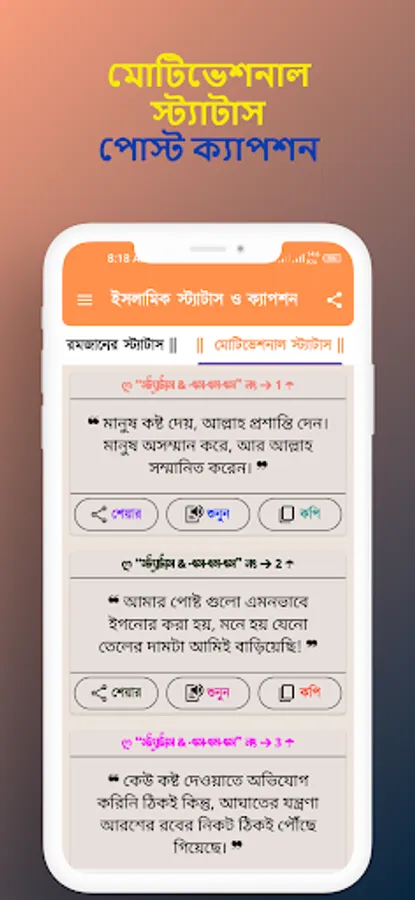 App provides thousands of newly selected Islamic Short SMS, Status, Posts and Eid Mubarak Status, Jumma Captions, Motivational Quotes, Ramadan Status, Various Islamic Sayings, Sunnah and Hadith. With this app you can get Islamic advice, motivational quotes and valuable sayings of Surah-Hadith. You can use this app to get necessary knowledge and comfort in daily life. Hope, you will enjoy the Islamic short sms, status, posts and quotes through this app and help you to get more growth and comfort in your life.