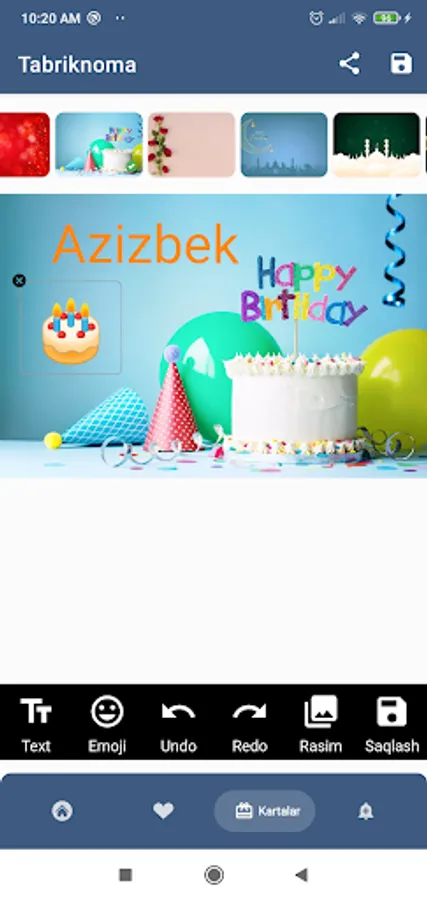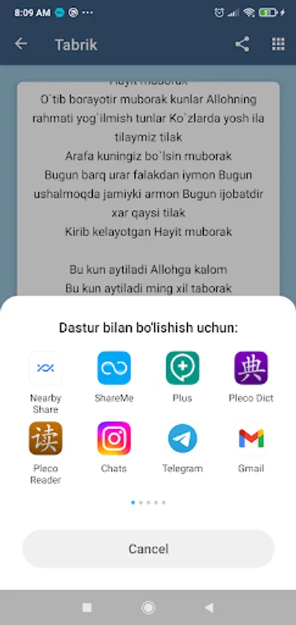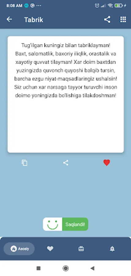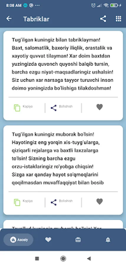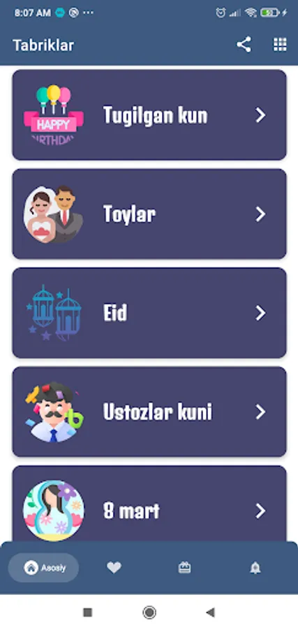 Har xil bayramlar bilan tabriklash bizning dasturimiz bilan juda osson. Kerakli tabrik yoki sherni tanlang va o'z yaqin insonlaringizga telegram, sms va boshqa ijtimoiy tarmoqlar orqali jo'nating. Ushbuilovada:
