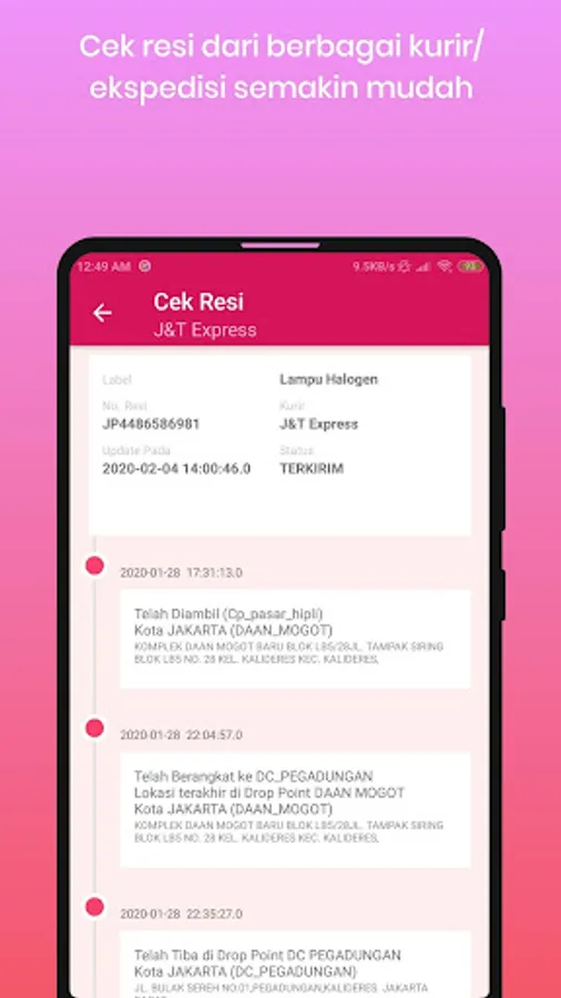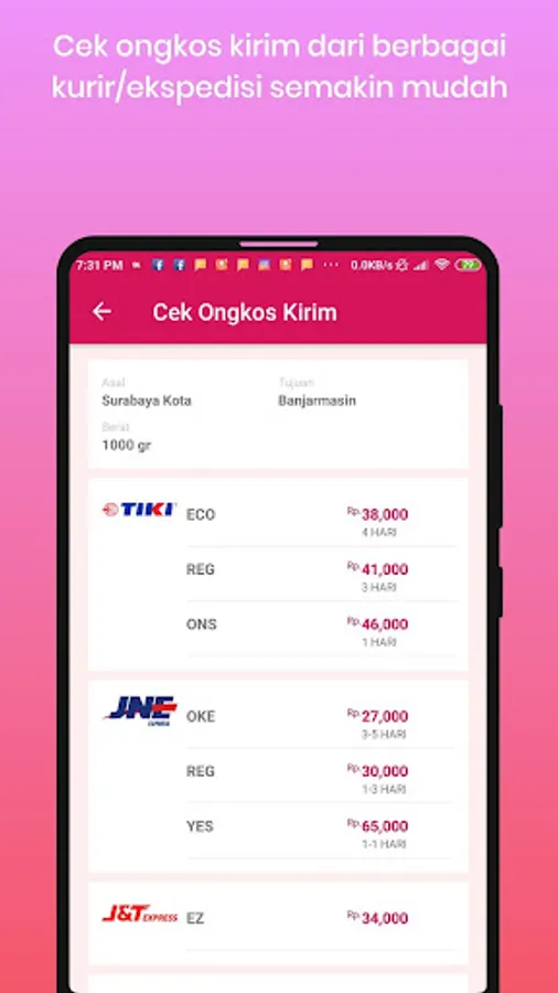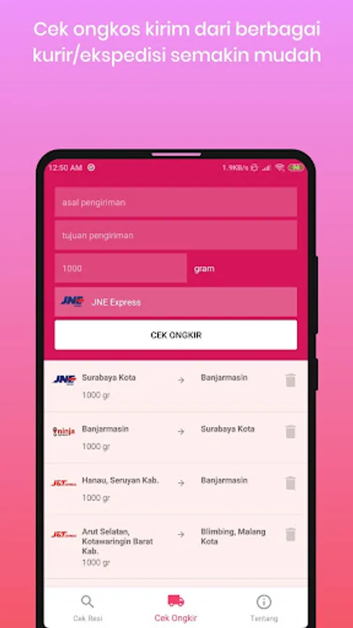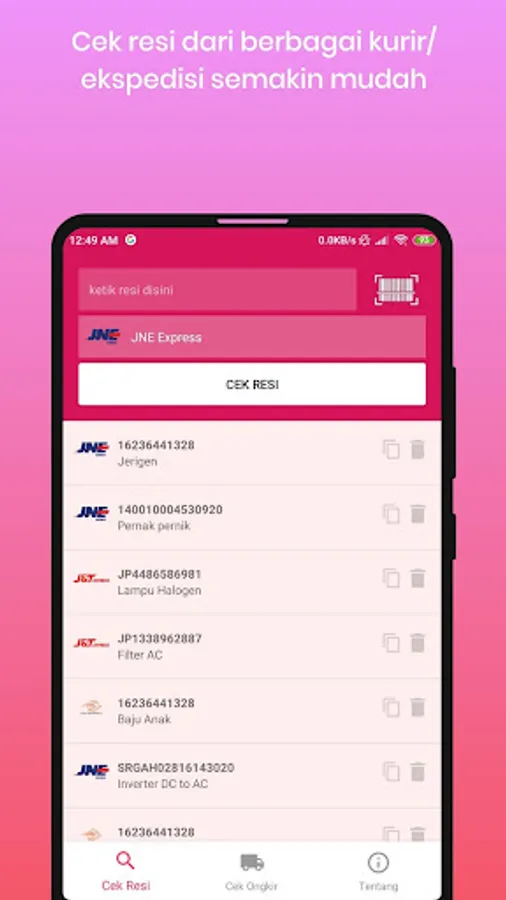 This application helps you to check the status or track your shipment packages quickly and easily from various services (couriers) accompanied by the Check Shipping Fee feature to all regions of Indonesia. You simply enter the receipt number and choose a courier and you can track the status of your shipment package. The receipt you entered is automatically saved and you can reopen it at another time without the need to type the receipt number again, simply by clicking on the list of receipts stored your package will be tracked. The list of saved receipts can also be deleted by pressing the trash can icon, and you can also copy the receipt number by pressing the copy icon.