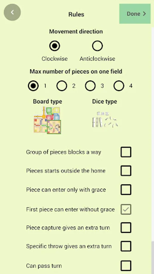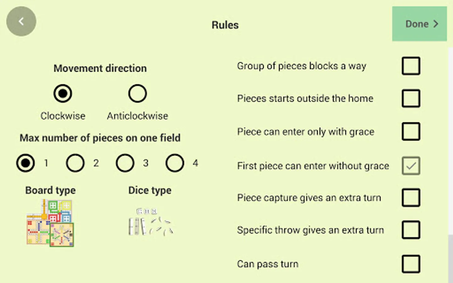 Choose if you want play with pieces, pawns or knobs. You can play in both ways, clockwise or anti-clockwise. You can select to play with a long dice, cubical dice or cowries, it's just up to you what you likes the most.