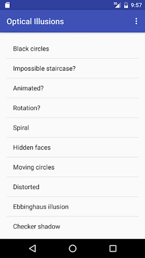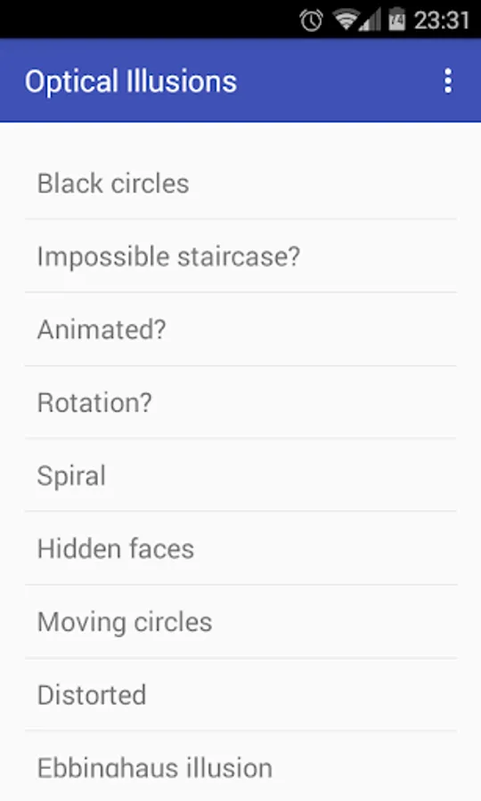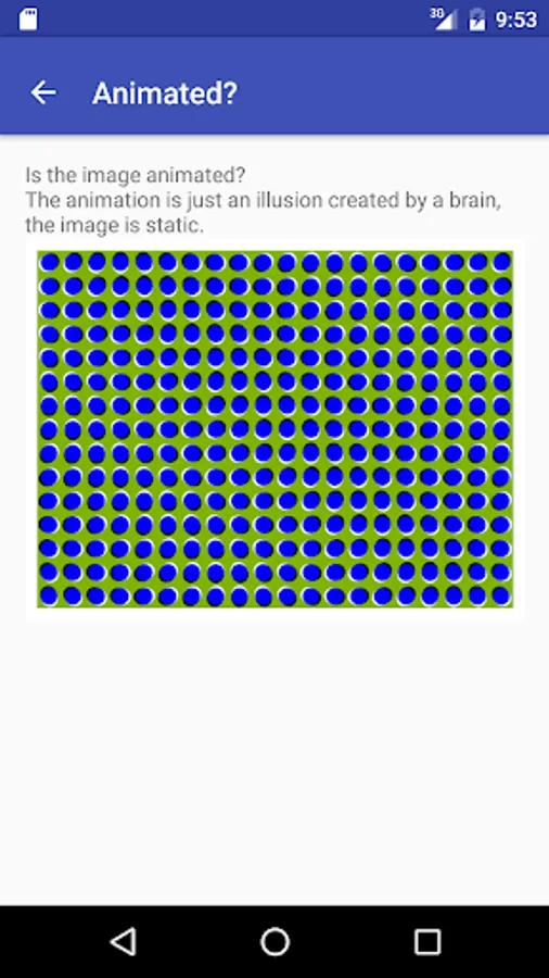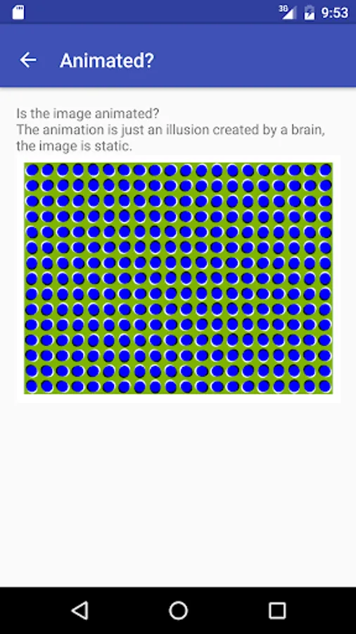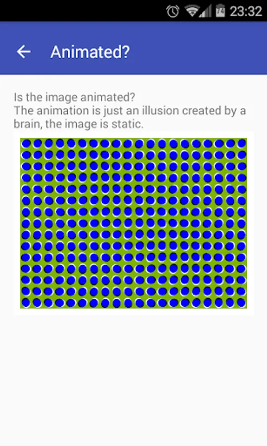 This application contains a number of interesting optical illusions to deceive your brain. You see the animation, different colors, different sizes of the same object or perhaps non-parallel lines? Send us your experiences.