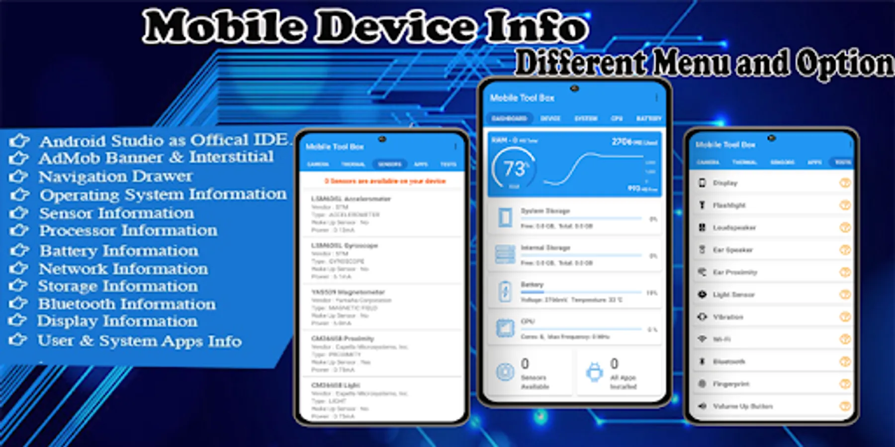 Mobile Box Tool application detect to all your mobile senor device and tell you your mobile sensor work properly your mobile . this sensor box tool tell your mobile device information and you know all about your mobile feature. When you install this app Sensor Toolbox application get your all mobile sensor available data and show data in graphically and show the x and y z axis .This app also get your mobile device information and show data in few second