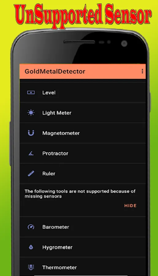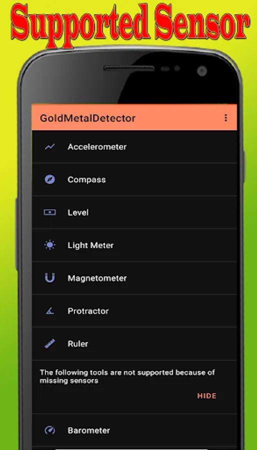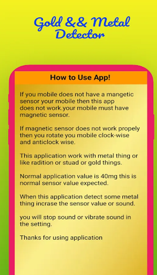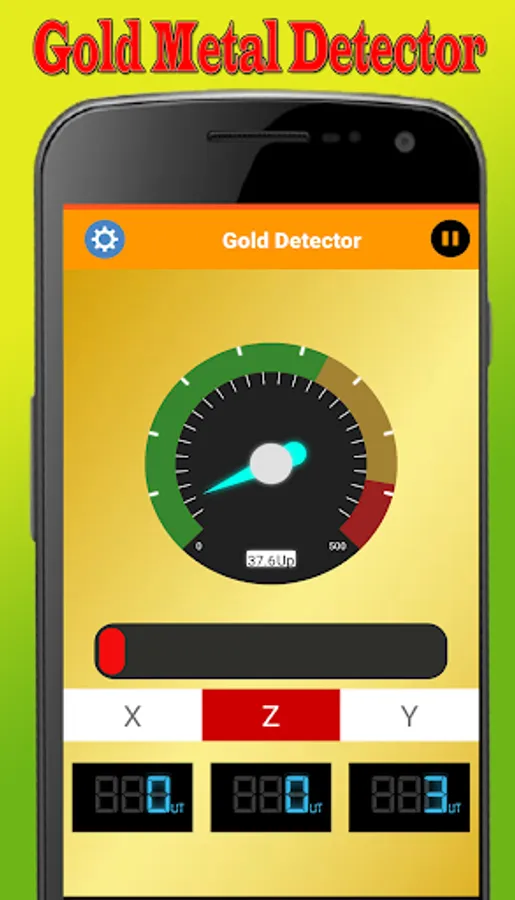 This gold simulator detector to detect easily gold thing because gold have metal use inside that why this application help for you and easily detect the metal things. If some metal or gold or stud thing then mobile magnetic sensor will be increase and sound will also be increase you don not have sensor then this application is useless. If you mobile sensor does not work propeller then you rotate your mobile anti clock or wise clock then you magnetic sensor work propeller.