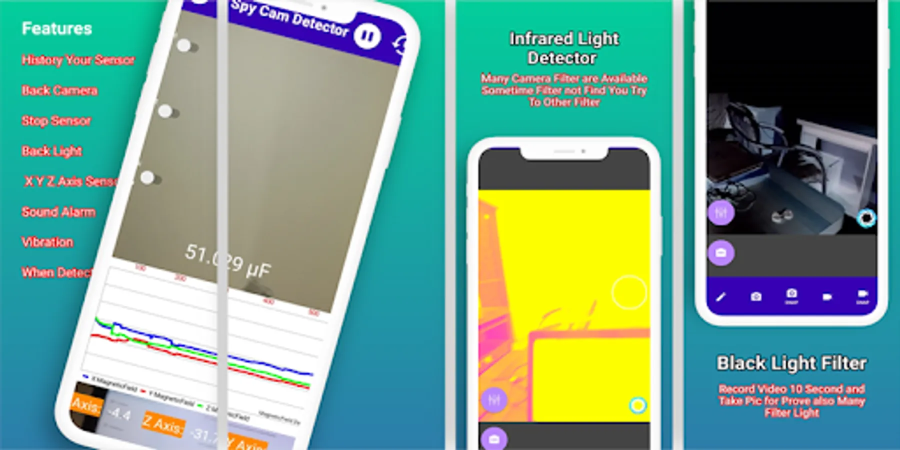 The infrared camera detector uses an LED light source to emit infrared light and a phototransistor on the detector side. This allows it to detect where the infrared light is coming from and then receiving it. just open app and move camera whole room if you see white light or red light appear on you