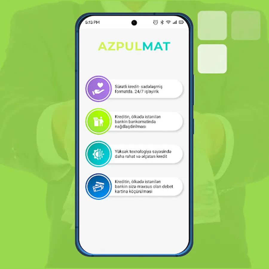 With the "Azpulmat" mobile application, you can get a loan instantly. With us, you can transfer the loan amount to your card without refusal and without applying to the bank.