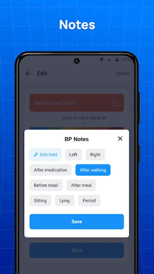 - Enter blood pressure readings by date, time